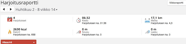 Juoksutreenit ovat siis loistaneet poissaolollaan, mutta sen sijaan vedessä olen ollut. Toiset uivat ennen uintikisoja, niin minä olenkin uinut kisojen jälkeen. Esim viikolla 14 tuli uitua 17 km. Eikä tuo ole ollut kelaustreeniä.